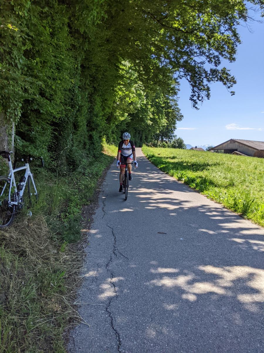 Zusammen fuhren wir zum Startpunkt, welcher gleichzeitig auch unsere Zielankunft für die nächsten 6 Runden war. Die Mittagssonne brannte schon kräftig auf unsere Köpfe und der erste Schweiss hinterliess einen salzigen weissen Film auf der Haut. Sepp stellte sich, nach der Einfahrrunde als Jurypräsident und Fotograf zur Verfügung. Er richtete sich, mit optimalem Sichtfeld auf die einzigen knackigen Rampe, ein und schoss fleissig die ersten Fotos.