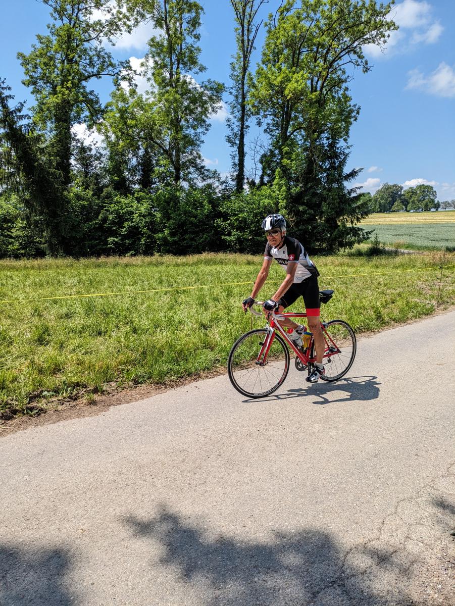 Pedro wählte wie bei den letzten zwei Rennen, wieder die gleiche Strecke, welche verkehrstechnisch optimal war, da wir 2/3 abseits vom Hauptverkehr fahren konnten. Zwischen den zwei Bauernhof-Betriebe gab es diesen knackig kurzen Aufstieg 6 x zu bezwingen. Nicht für mich, da ich bereits bei der Einfahrrunde den Männern mitgeteilt hatte, dass sie zufahren und am offiziellen Start nicht auf mich warten sollten. Da sich Dario und Pedro bereits nach der 2. Runde von der Gruppe absetzte, wurde ich relativ schnell von den Beiden überrundet. Irgendwann rausche Marcel, später Hanspeter und zum Schluss auf meiner 4. Runde auch Viktor an mir vorbei. Da Niemand im Ziel Fotos machte, beendete ich nach 4 Runden das Rennen und konzentrierte mich auf die Zieleinfahrten. Viel Zeit blieb nicht übrig für die Kameraeinstellung, den Pedro war bereits in Sichtweite und fuhr als Sieger dieses Rennens über die Ziellinie. Kurz darauf folgte Dario als Zweiter. Nach und nach trafen auch Marcel, Hanspeter und Viktor ein.