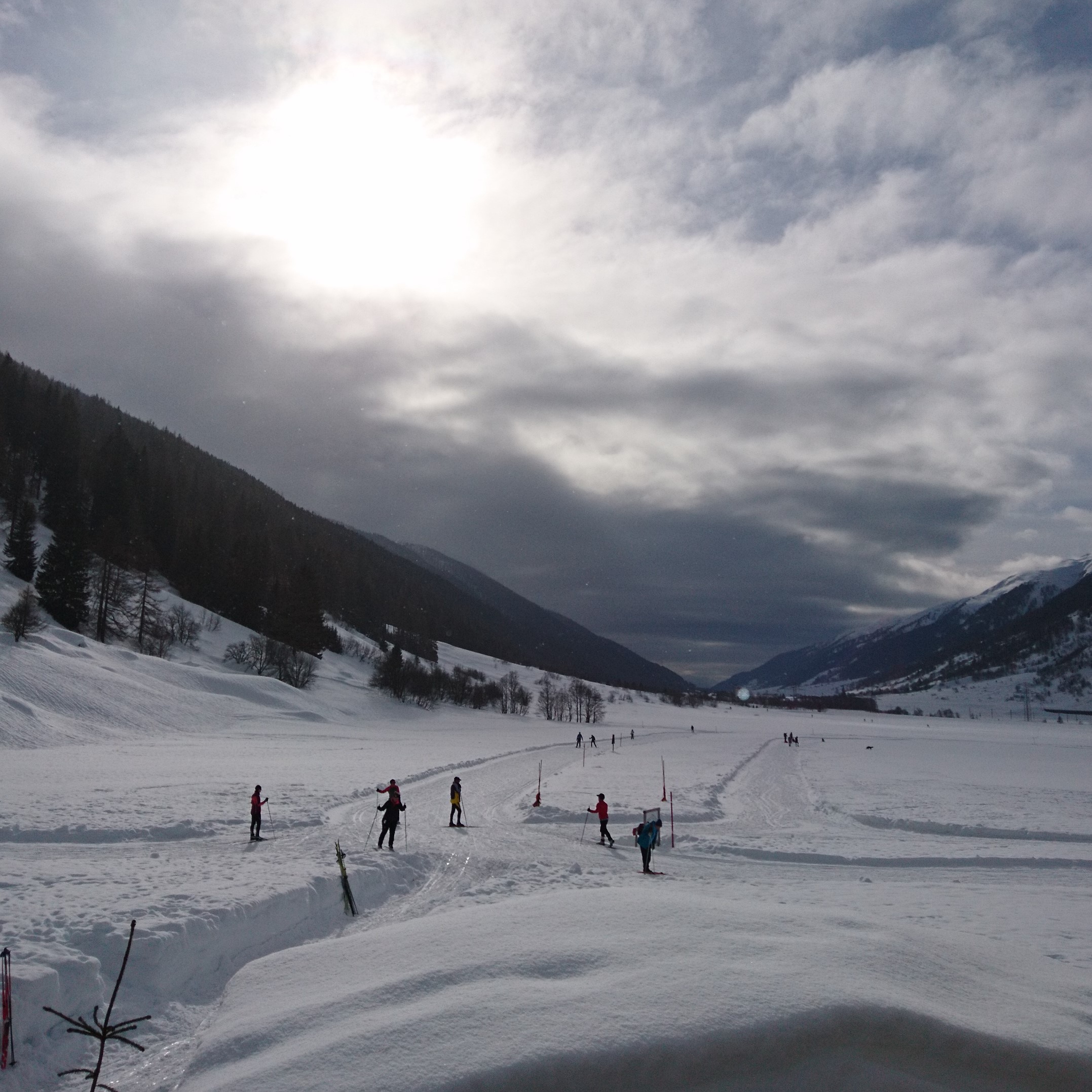 Christian "flog" mit seinen frischgewachsten Langlaufskiern wie auf Wolken über die Loipe. Die ganz Schnellen setzten sich ziemlich schnell ab und die Schnellen sah man immer in Sichtweite vor den nicht so Schnellen hergleiten. Auf halbem Weg hatte sich Dominik uns angeschlossen und von Roger hatten wir die Info, dass er kurz Pedro und Co. getroffen hat und mit ihnen gelaufen ist. Eine Gruppe (nicht die ganz Schnellen) vereinbarten einen Treffpunkt beim Campingplatz "Augenstern" und machten dort eine Kaffeepause.