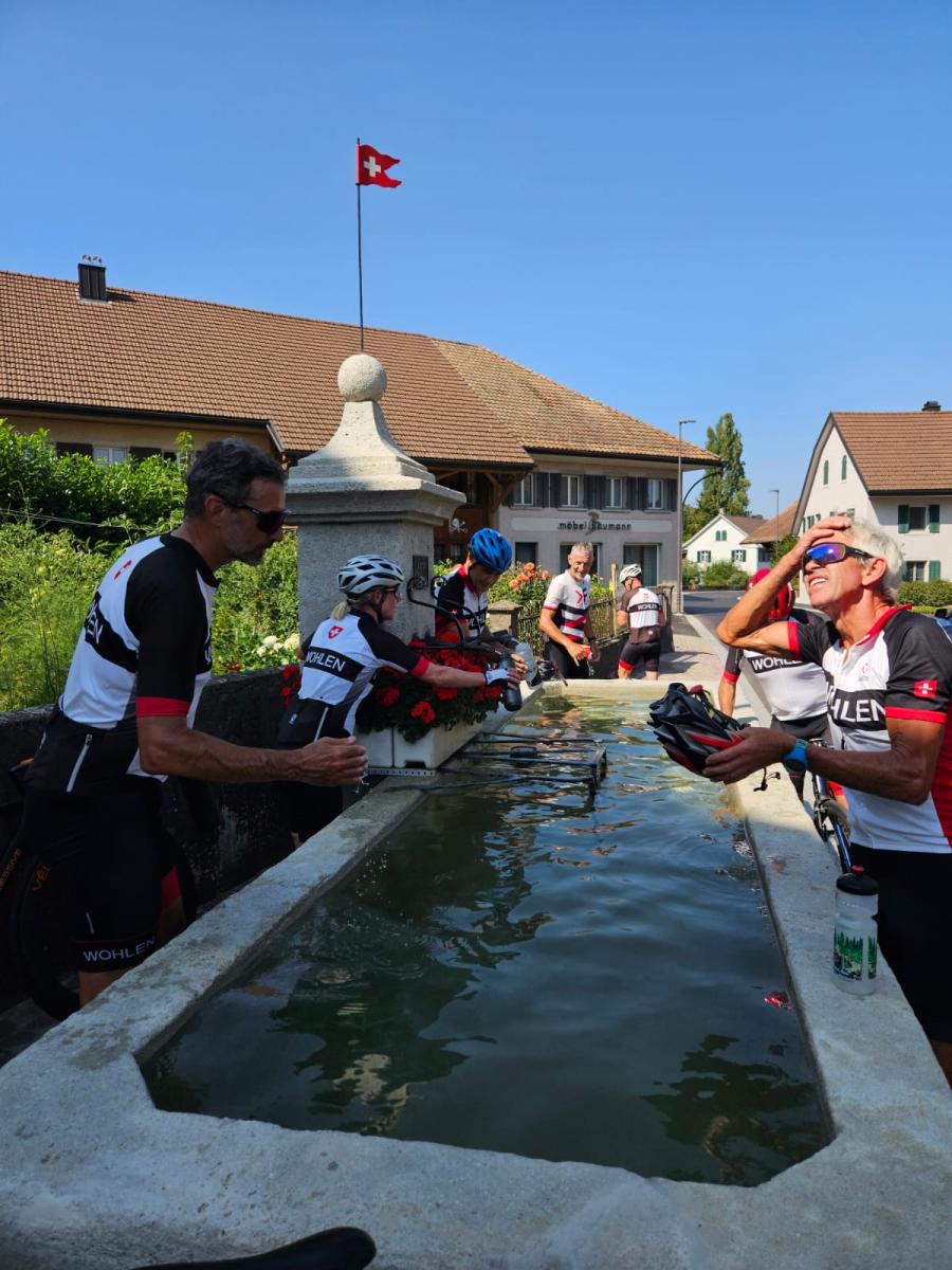 Beim Grenzübergang Rhein Deutschland-Schweiz gab es noch einen Fotohalt 📷 mit Kernkraftwerk Leibstadt im Rücken. Einen kurzen Wasserhalt inkl. "Kneipen" im Brunnen lag ebenfalls noch im Zeitplan drin. Dany stieg samt Veloschuhen in den Brunnen und genehmigte sich ein Fussbad. Leider habe ich verpasst, ein Beweisfoto zu schiessen. Vielleicht beehrt er uns ja wieder einmal auf einer unserer tollen Velo-Club Ausfahrten.