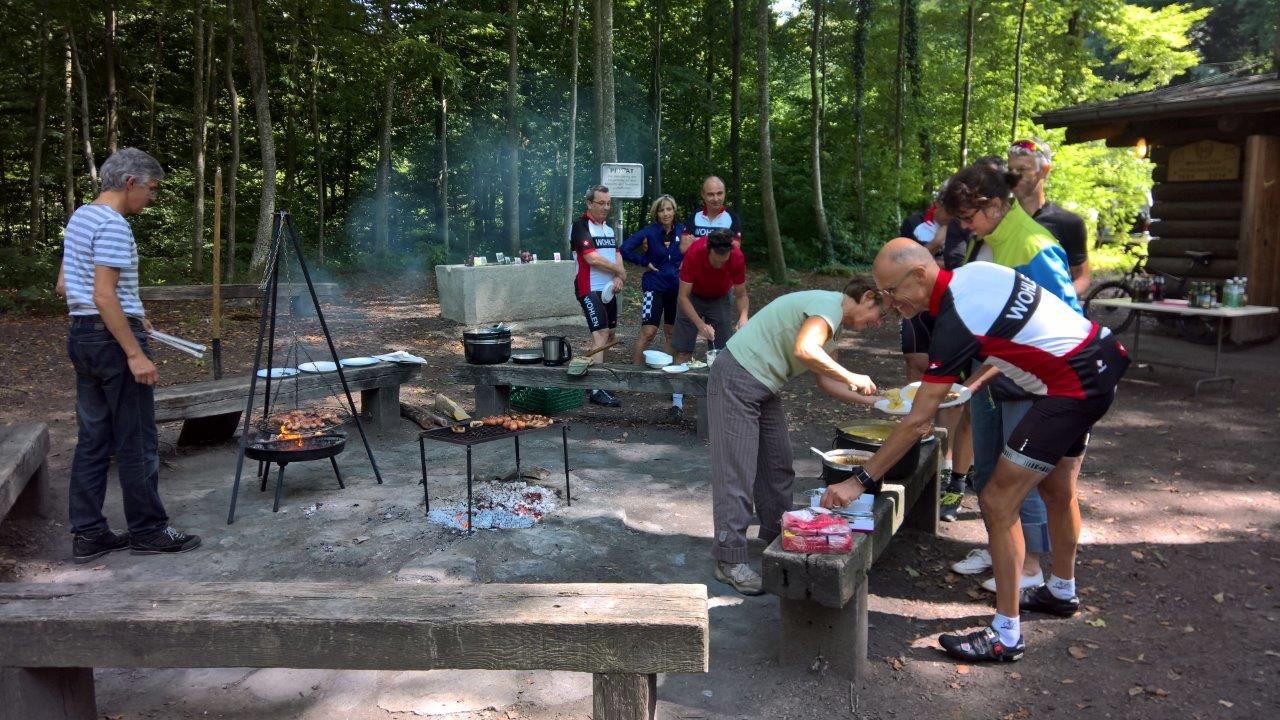 Am Sonntag, 20. August 2017 trafen sich 27 Personen zu einer Velotour (Rennvelo und Bike) mit anschliessendem Hock bei der Waldhütte "Fröscheteich" mit Verpflegung aus der "Clubküche". Rosmarie und Hanspeter Zaugg-Flori verwöhnten uns mit Salat, Polenta, Luganighe, Bratwurst und Cervelat. Danach gab es von Rosmarie, Daniela und Christina gebackene Kuchen zum Dessert. Herzlichen Dank an diese Personen!