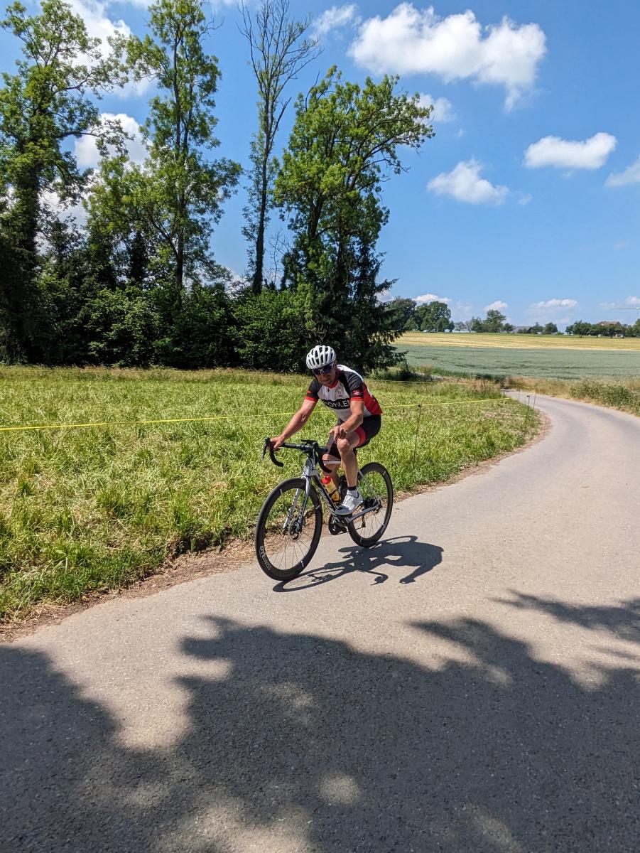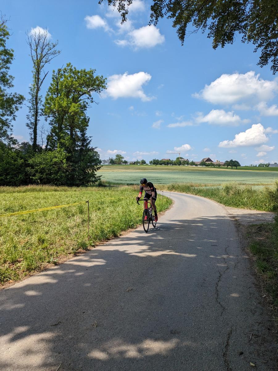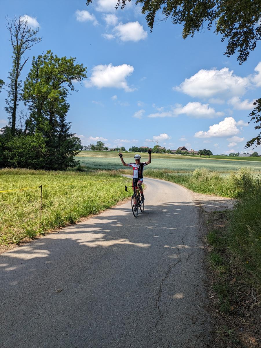 Pedro wählte wie bei den letzten zwei Rennen, wieder die gleiche Strecke, welche verkehrstechnisch optimal war, da wir 2/3 abseits vom Hauptverkehr fahren konnten. Zwischen den zwei Bauernhof-Betriebe gab es diesen knackig kurzen Aufstieg 6 x zu bezwingen. Nicht für mich, da ich bereits bei der Einfahrrunde den Männern mitgeteilt hatte, dass sie zufahren und am offiziellen Start nicht auf mich warten sollten. Da sich Dario und Pedro bereits nach der 2. Runde von der Gruppe absetzte, wurde ich relativ schnell von den Beiden überrundet. Irgendwann rausche Marcel, später Hanspeter und zum Schluss auf meiner 4. Runde auch Viktor an mir vorbei. Da Niemand im Ziel Fotos machte, beendete ich nach 4 Runden das Rennen und konzentrierte mich auf die Zieleinfahrten. Viel Zeit blieb nicht übrig für die Kameraeinstellung, den Pedro war bereits in Sichtweite und fuhr als Sieger dieses Rennens über die Ziellinie. Kurz darauf folgte Dario als Zweiter. Nach und nach trafen auch Marcel, Hanspeter und Viktor ein.