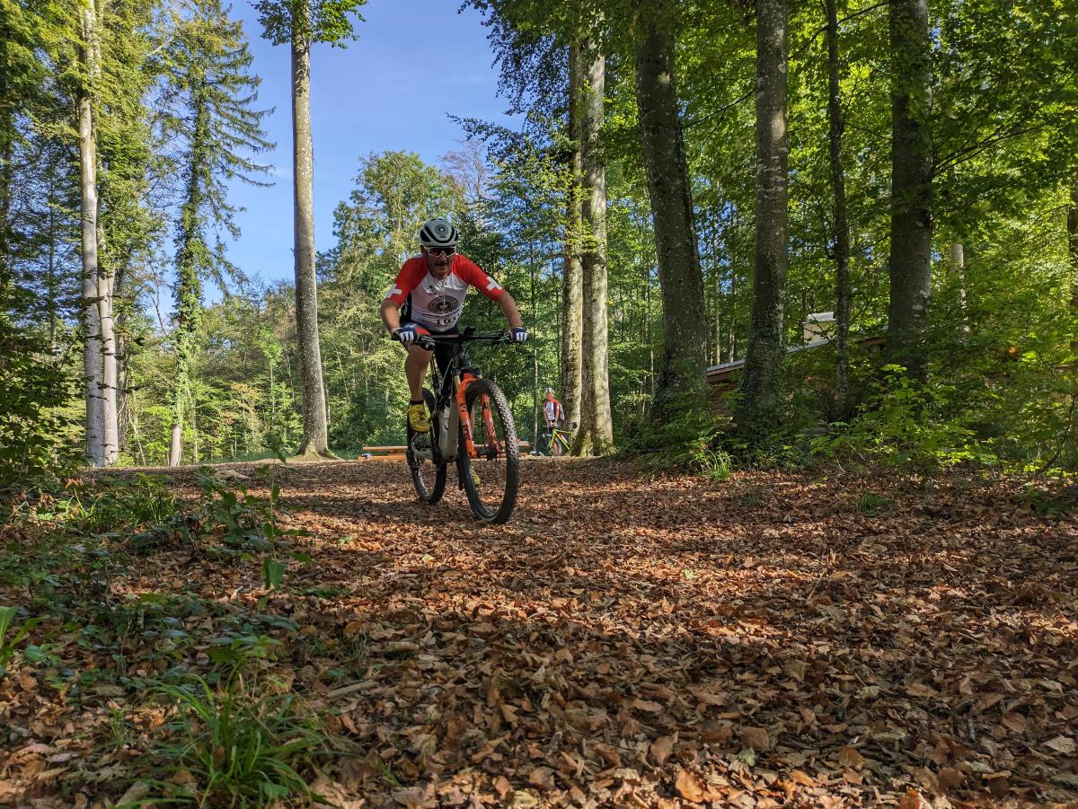 Es gab 6 Runden bzw. die erste Einfahrrunde galt zur Streckenbesichtigung, zu fahren. Bereits nach der zweiten Runde war die Rangliste mehr oder weniger klar. Roger dominierte trotz zweimaligem Verfahren und fuhr als Sieger durchs Ziel. Ebenso war Marcels 2. Platz gesichert. Reto durfte aufs Treppchen Nr. 3 und Dani wurde vierter. Ernesto nahm es sichtlich gemütlicher und fuhr als fünfter über die Ziellinie. Es fehlte nur noch Viktor. Er hatte nichts zu verlieren, denn sein (Club)-Meistertitel konnte ihm niemand mehr nehmen. Als Ausnahmekategorie bezwang Dominik mit seinem E-Bike, die kniffligen Passagen vermutlich mit links. Seine treuste vierbeinige "Anhängerin" 🐶, wartete geduldig bis er nach 6 Runden ebenfalls ins Ziel fuhr.